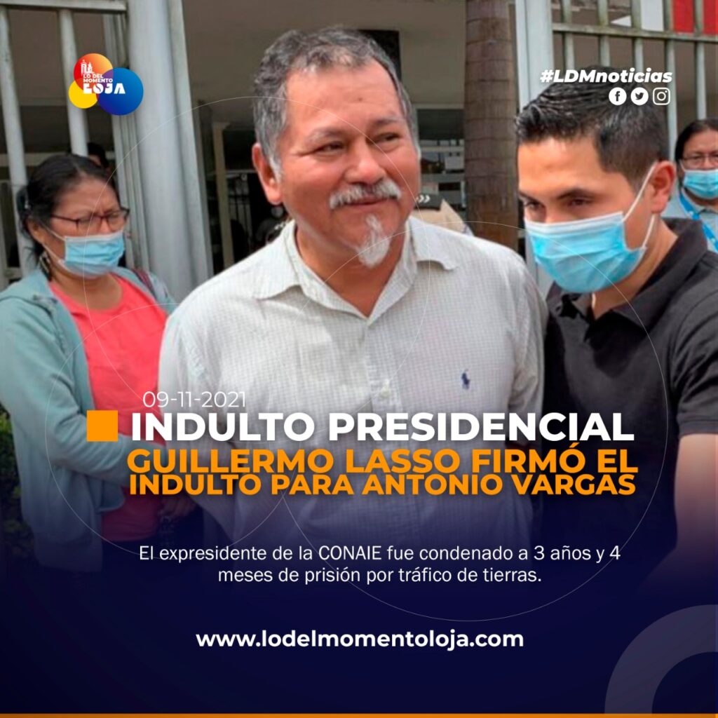 El Presidente de la República, Guillermo Lasso, firmó el indulto para Antonio Vargas, expresidente de la Conaie, quien fue condenado a tres años y cuatro meses de prisión y al pago de 12 salarios básicos unificados; es decir, USD 4.800 por tráfico de tierras. Vargas cumplía su sentencia en la cárcel de Morona Santiago y con esta decisión saldría en libertad de manera inmediata.