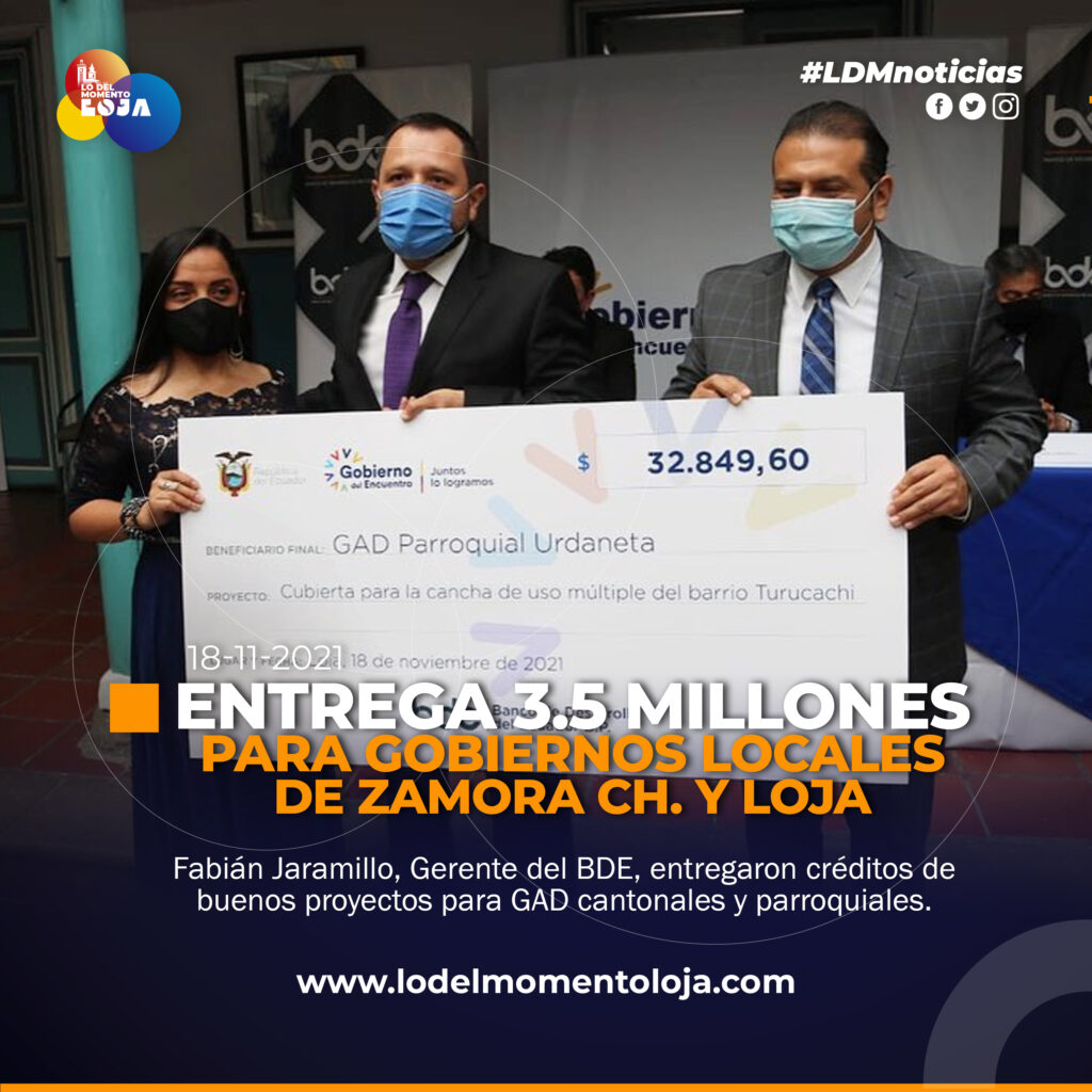 El gerente general del BDE Fabián Carrillo Jaramillo, junto al gobernador de la provincia Mario Mancino, el prefecto Rafael Dávila y los alcaldes de Puyango, Olmedo y Espíndola, y juntas parroquiales de las provincias de Loja y Zamora Chinchipe, tuvieron un encuentro para la entrega de cheques por más de USD 5.3 millones de dólares.