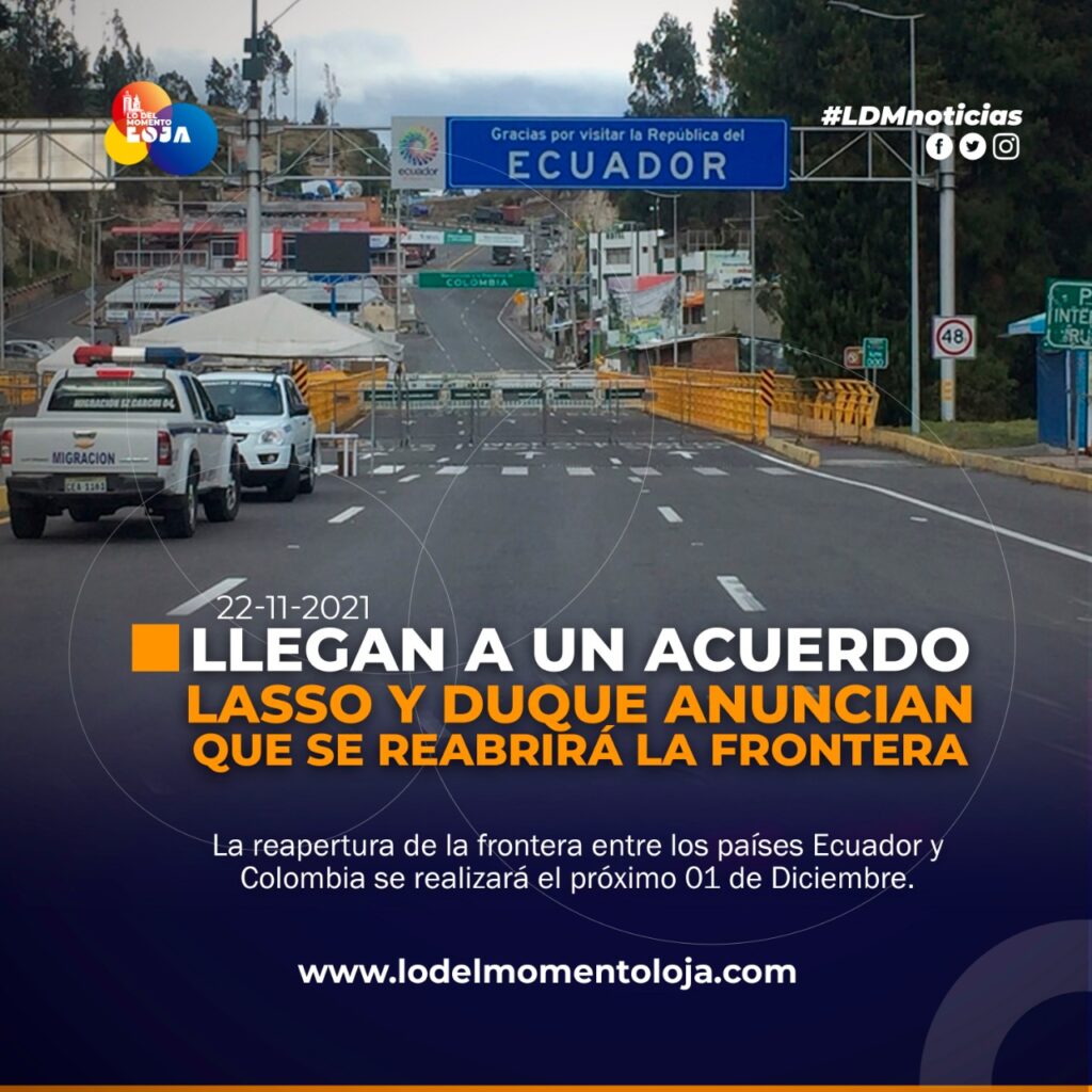 Los Gobiernos de Ecuador y Colombia acordaron este domingo la reapertura de su frontera terrestre a partir del 1 de diciembre con el fin de impulsar la actividad comercial y los lazos bilaterales, tras un cierre de año y medio por la pandemia de la covid-19.