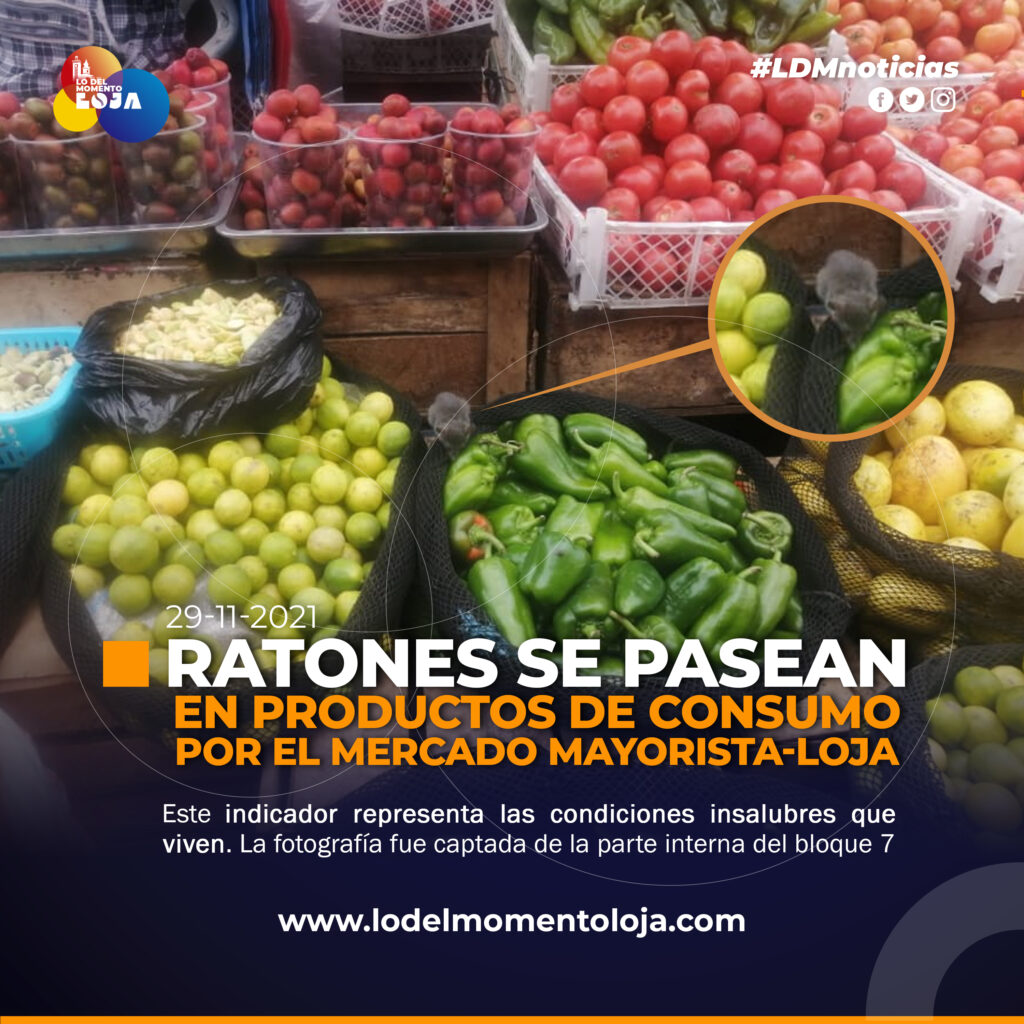 Ciudadanos del sector donde se encuentra ubicado el Mercado Mayorista de la ciudad de Loja, se han quejado la exposición de los productos de primera necesidad, en razón de ello, mediante una denuncia a este medio digital, se puede observar como ratones se pasean por encima de algunos productos. Esto se da por la parte posterior del Bloque 7, en el denominado “canchón”, a pocos pasos de la calle Santo Domingo.