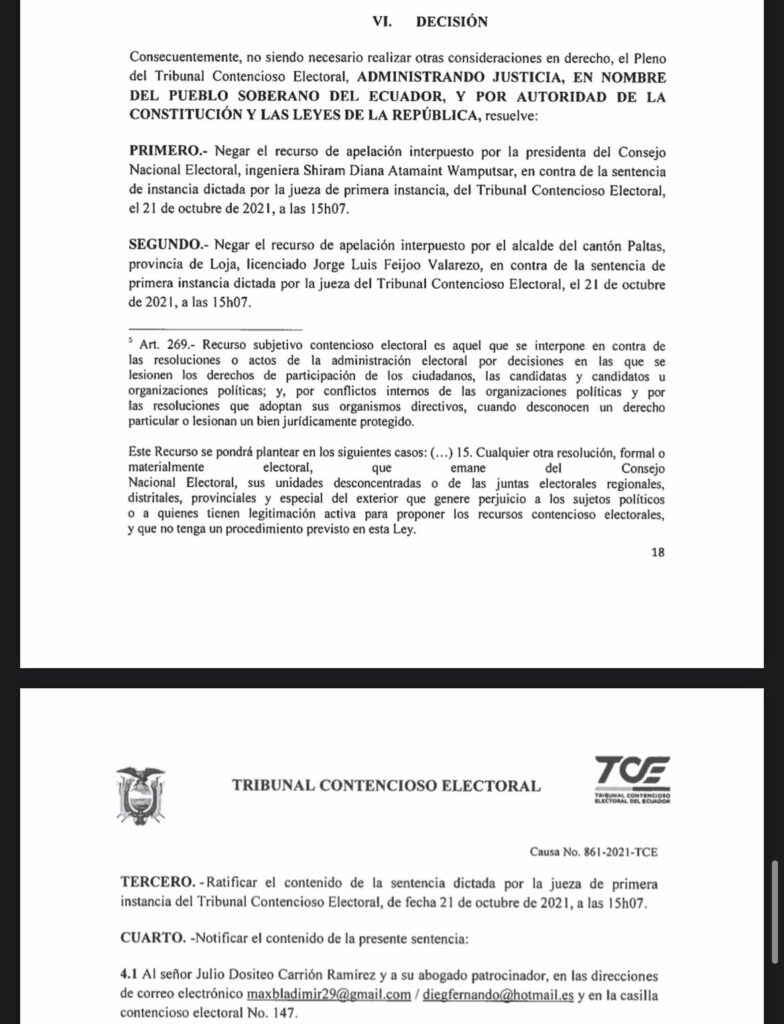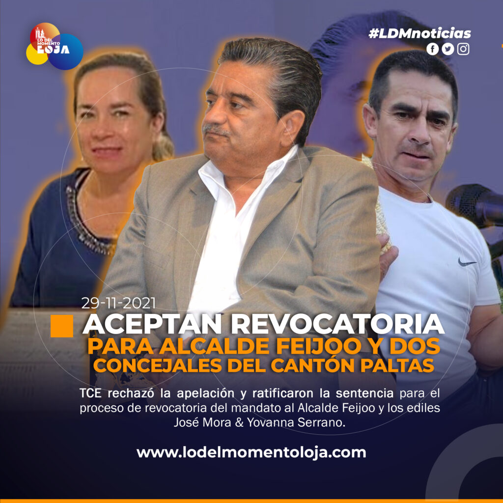 El Tribunal Contencioso Electoral (TCE) rechazó el recurso de apelación interpuesto por la Presidenta del CNE Diana Atamaint y el Lic. Jorge Luis Feijoo en contra de la sentencia de primera instancia dictada por la jueza del TCE, con ello, acto que dará paso al proceso de revocatoria del mandato del Alcalde de Paltas Jorge Luis Feijoo y los ediles José Mora & Yovanna Quevedo Serrano.