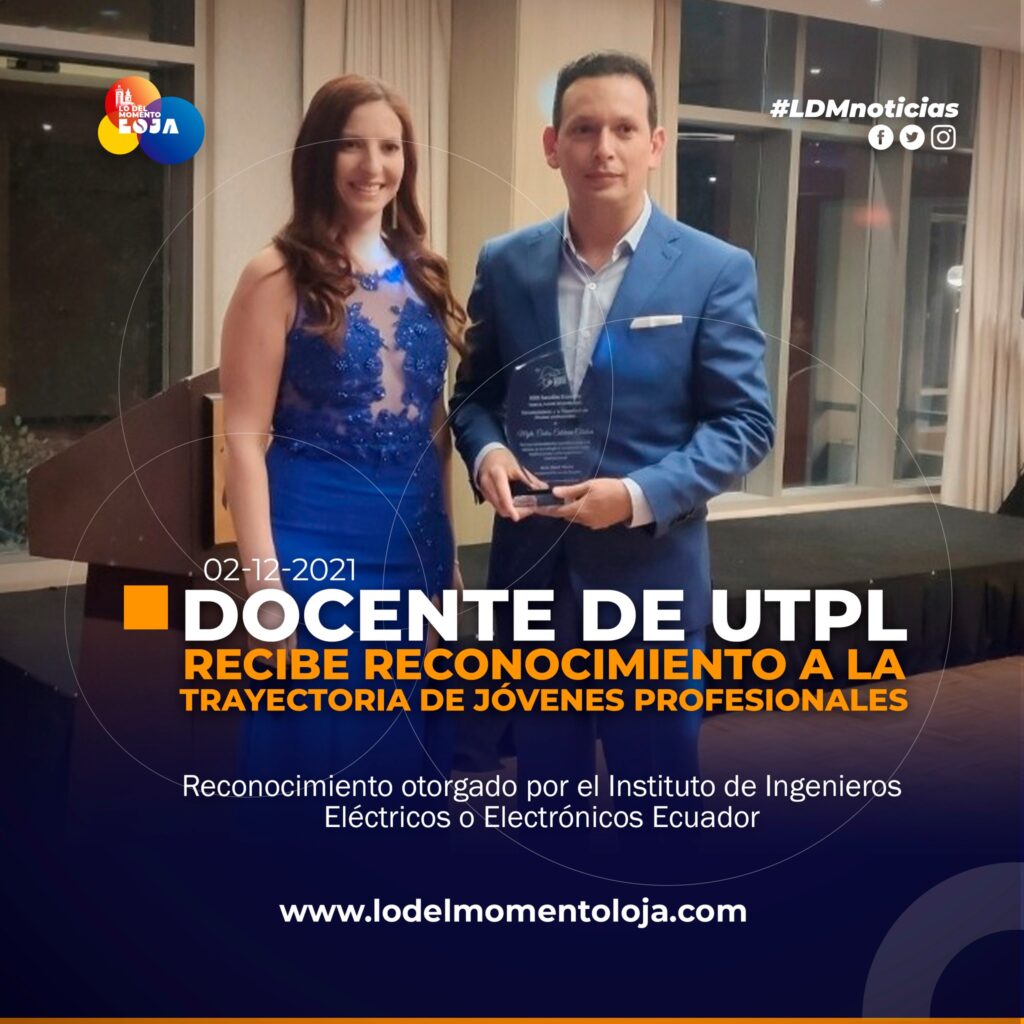 El Mgtr. Carlos Calderón Córdova, Docente de la Carrera de Telecomunicaciones de la UTPL, obtuvo el Reconocimiento a la Trayectoria de Jóvenes profesionales. Este premio reconoce la Trayectoria de Jóvenes Profesionales con menos de 15 años de experiencia en la industria y/o la academia y se encuentren radicados en el Ecuador.