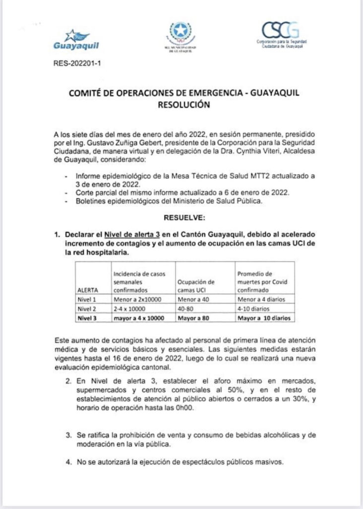Cabe recordar, que el pasado 27 de diciembre 2021, el COE Nacional había resuelto que Guayaquil pase en Altera 2, de igual forma por el aumento de ocupación en camas UCI.