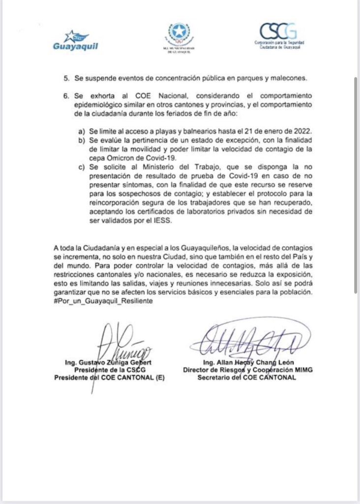 Dentro de las medidas optadas por Viteri y el COE Guayaquil, mismas que entrarán en vigencia a partir del 16 de Enero del 2022, se encuentran: