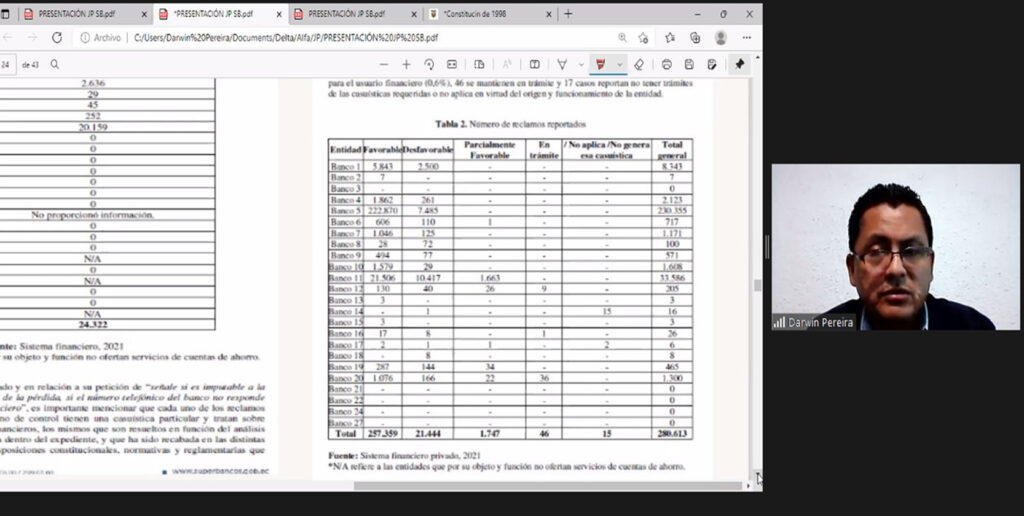 De la información expuesta por el legislador Pereira, indicó que solicitó información a la Superintendencia de Bancos y remitió los datos sobre los reclamos, pero ocultó la identidad de los bancos, identificándolos como banco 1, banco 2, banco 3, entre otros, pero lo curioso, es que del porcentaje total de estos reclamos, solo una entidad financiera registra 222 mil de 287 mil de los reclamos, es decir, casi un 77% del total, pero ¿Cuál será?.