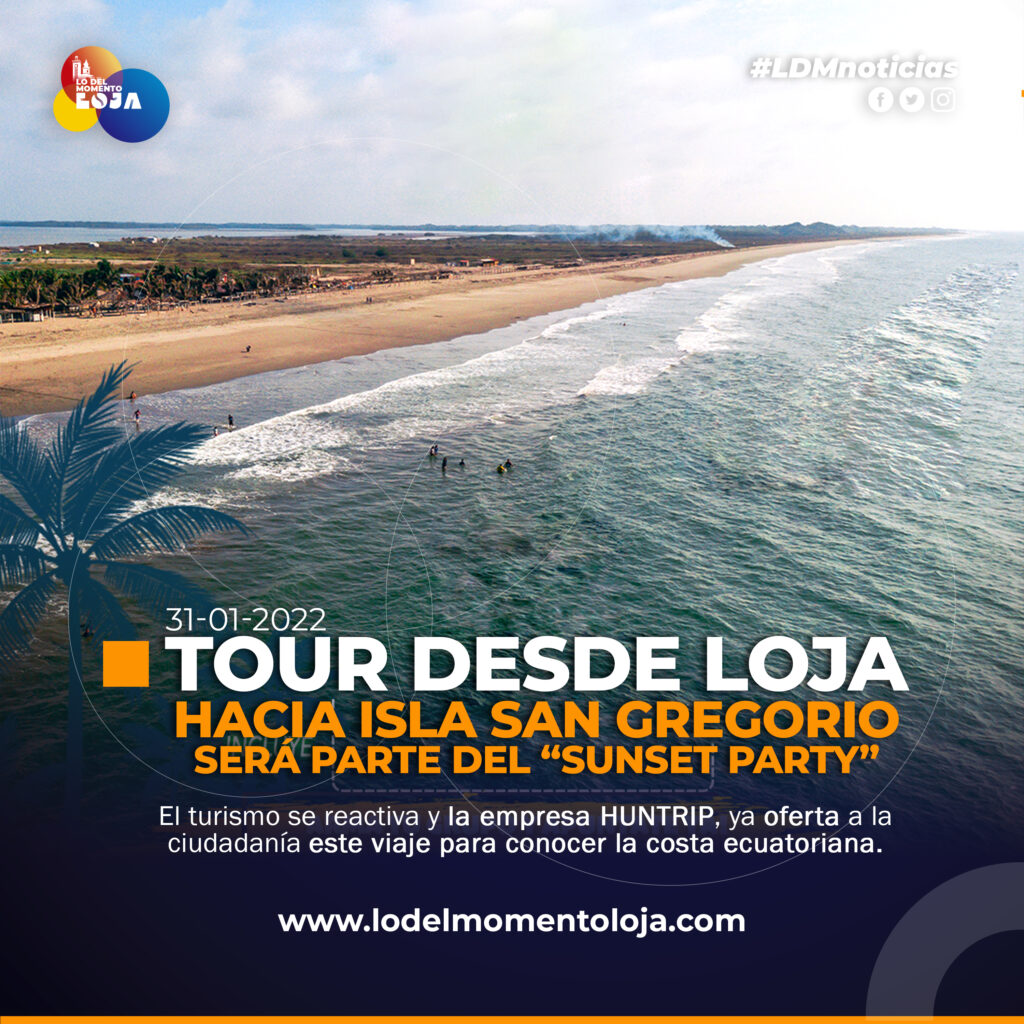 La empresa de turismo Huntrip, organiza un evento denominado “SUNSET PARTY” para el sábado 12 de febrero del 2021, este tour tiene como finalidad viajar desde la provincia de Loja hasta la Isla San Gregorio con un itinerario lleno de actividades para pasarla en familia o entre grupo de amigos aventureros.