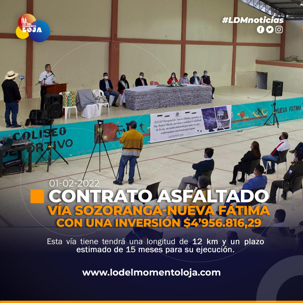 Como un día histórico es calificado el 29 de enero de 2022 en la parroquia Nueva Fátima, pues la Prefectura de Loja firmó el contrato para el asfaltado de la vía de 12km que los une con la cabecera cantonal de Sozoranga. Al evento concurrieron el prefecto Rafael Dávila, la viceprefecta María José Coronel, el asambleísta Byron Maldonado, consejeros provinciales, autoridades cantonales y parroquiales.