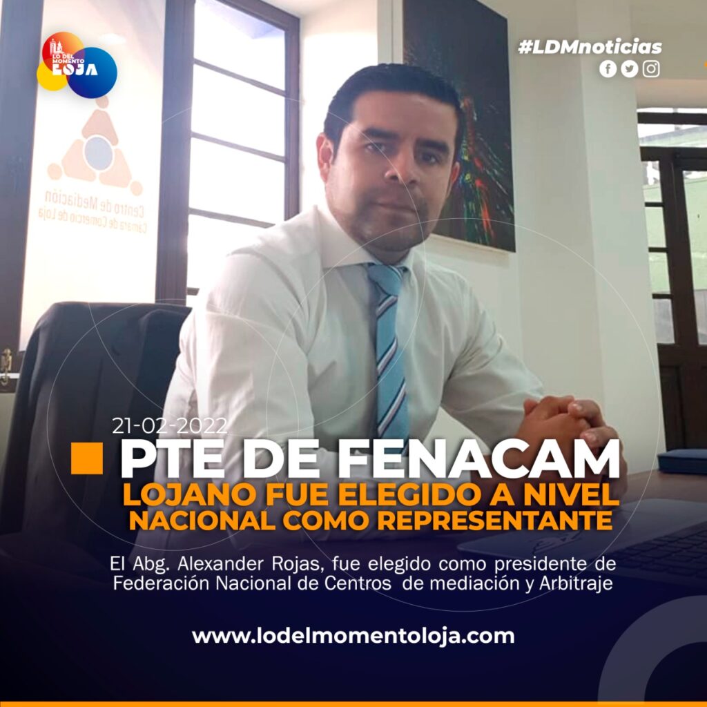 El Abg. Alexander Rojas Vivanco y actual director del Centro de Mediación de la Cámara de Comercio de Loja (CCL), fue designado presidente de la Federación Nacional de Centros de Arbitraje y Mediación del Ecuador (Fenacam).