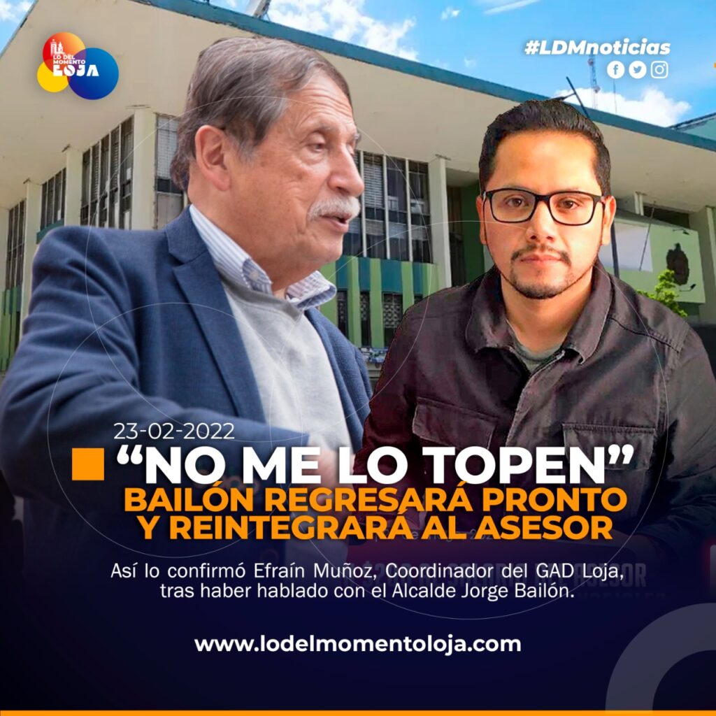 #Loja | Según Efraín Muñoz, Coordinador General del GAD Loja y hombre cercado en las administraciones de Jorge Bailón, manifestó que se ha comunicado con el burgomaestre sobre el cese de funciones de los asesores, donde se encuentra el polémico Juan Pablo Montoya y hablan de regresarlos al Municipio de Loja. “Estos días he mantenido contacto con el Ing. Jorge y cuando nuevamente asuma sus funciones tomará las acciones pertinentes para reincorporar a los compañeros destituidos de la administración” dijo Muñoz ante un medio radial.