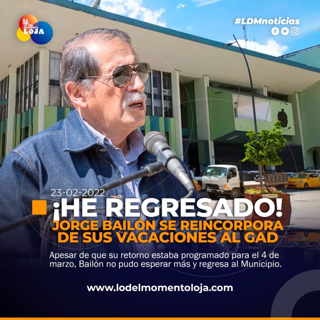 Mediante un oficio firmado por el alcalde de Loja, Ing. Jorge Bailón pone a conocimiento que desde el Jueves 24 de Febrero del 2021 se reintegra a sus funciones, a la vez dando por cuncluidas sus vacaciones.