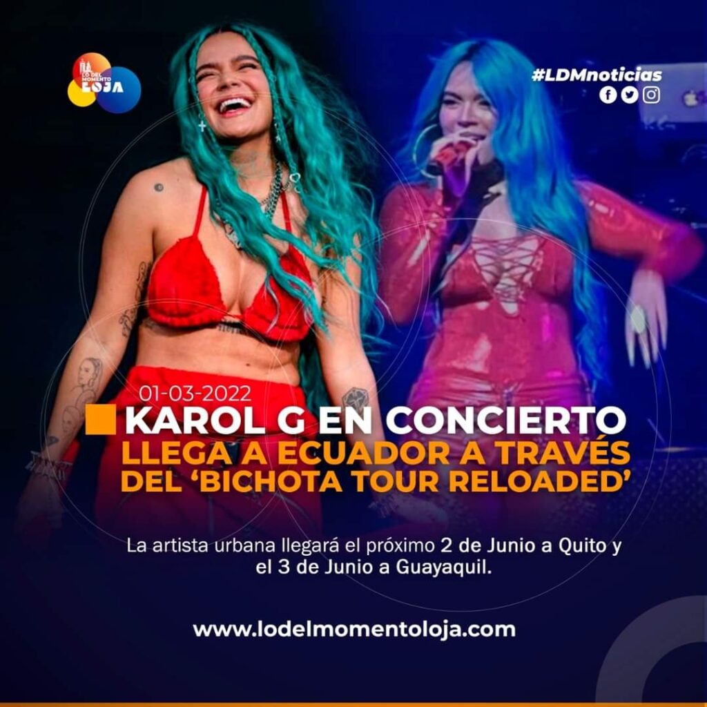 Karol G se presentará el próximo 2 de junio en el Coliseo Rumiñahui de Quito, y el 3 de junio en el Coliseo Voltaire Paladines Polo de Guayaquil.