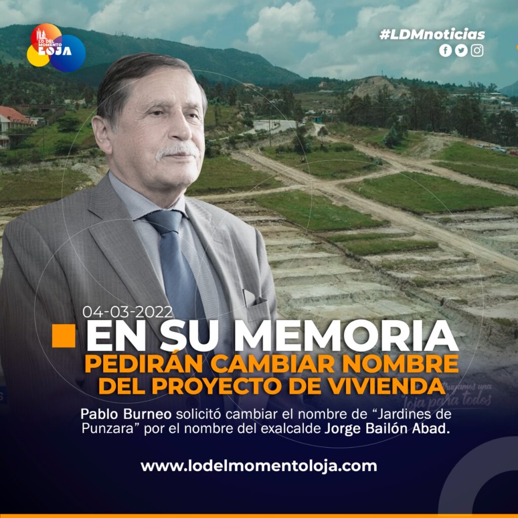 #Loja | Luego de la reunión entre la Acaldesa Picoita y los concejales del cantón Loja, han trazado varias líneas de trabajo con la finalidad de poder darle seguimiento a los proyectos del Municipio de Loja. Un tema adicional que se ha solicitado en dicha reunión, fue lo planteado por el concejal Pablo Burneo, buscando cambiar el nombre del proyecto de vivienda Jardines de Punzara por el nombre del exalcalde Alcalde Jorge Bailón, en memoria ante el trabajo social y vivienda pública que desplegó durante sus años.