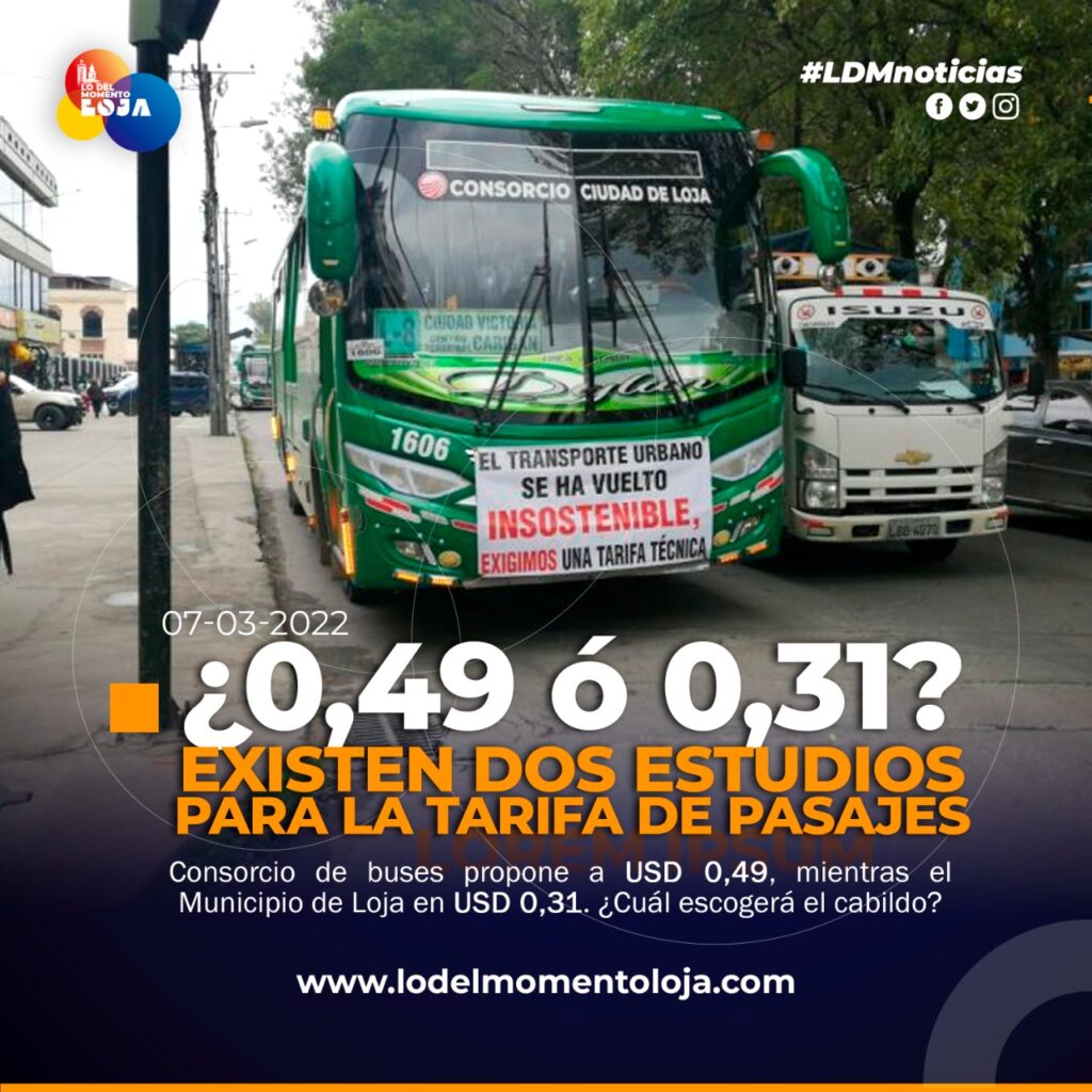 #Loja | La inestabilidad y dispersión de criterios con respecto a la tarifa del pasaje del bus urbano sigue siendo una inquietud en la ciudanía y desde algunos meses, representantes del Consorcio Ciudad de Loja aspiran que se incremente el pasaje para que pueda ser rentable, aduciendo que el resultado de la pandemia ha dejado una reducción en sus ingresos y que no quieren llegar a paralizar el servicio; sin embargo, ellos han realizado un estudio que determina el pasaje de USD 0,30 a 0,49, y el pasaje medio de USD 0,15 a 0,24, cifras que han causado el total rechazo en redes sociales.