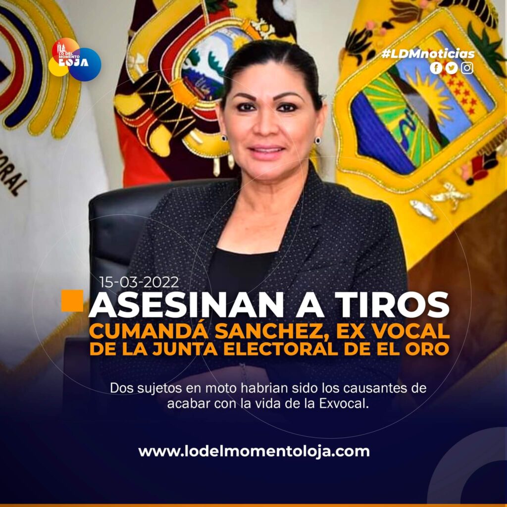 Pasadas las 09:00 de este martes 15 de marzo, se registró un asesinato tipo sicariato en la calle Santa Rosa entre Guabo y Kleber Franco de la ciudad de Machala. La víctima fue identificada como Cumanda Ibelia Sanchez Benítez, ex vocal del tribunal electoral de El Oro.