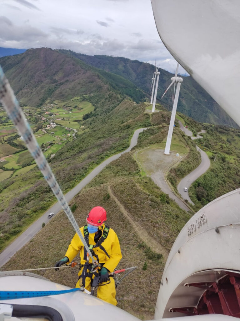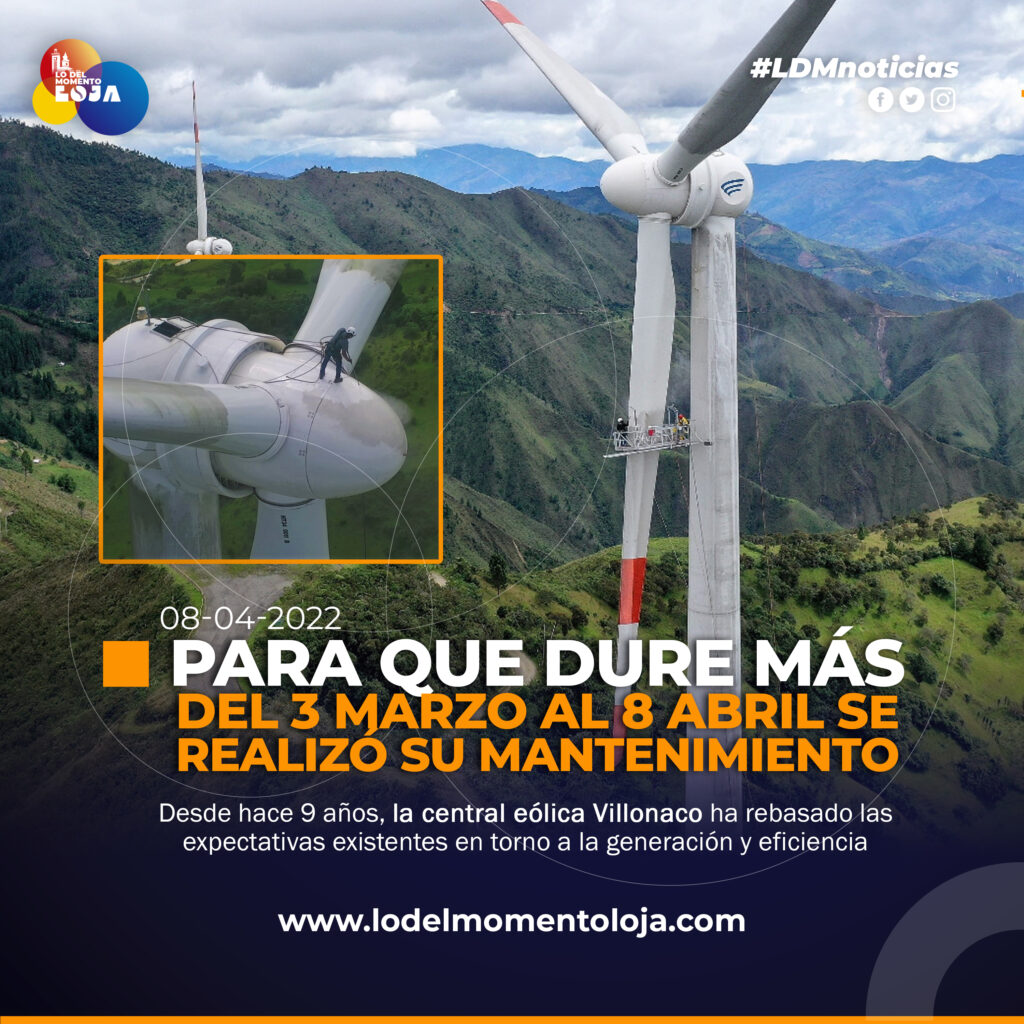 Del 3 de marzo al 8 de abril de 2022, se realizó el mantenimiento semestral eléctrico preventivo de la central eólica Villonaco, ubicada en la provincia de Loja. En este proceso se ejecutó también la revisión de la parte externa y limpieza de los aerogeneradores.