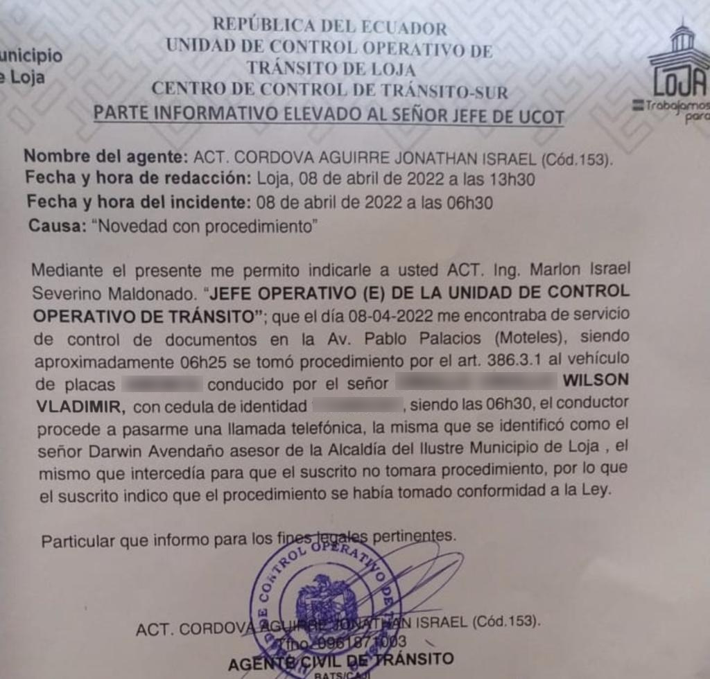 El viernes 8 de abril del 222, personal de la Unidad de Control Operativo de Tránsito de Loja realizaban un operativo rutinario de control de documentos en la Av. Pablo Palacios (por los moteles), un ciudadano de nombres Wilson C, fue detenido por un agente de tránsito entre las 06h30 am, situación que hizo que este ciudadano se comunique con el asesor de Patricia Picoita, Darwin Avendaño, y tras haberle pasado el teléfono celular, el asesor intercedió para que el agente no realice un procedimiento, acto que fue registrado mediante un documento de parte informativo.