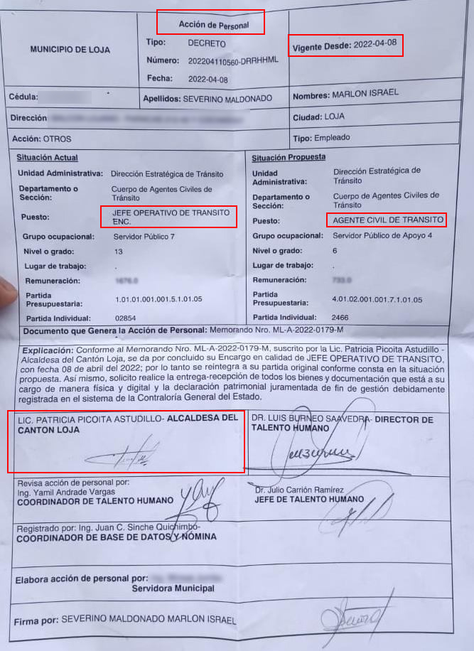 Mientras que por el lado de Darwin Avendaño, argumenta que no intervino en lo que menciona el informe de las primeras horas de la mañana, un hecho sospechoso deja duda la actuación de la función que desempeña este funcionario, pues luego de lo ocurrido, en el mismo día, la Alcaldesa firmó una acción de personal donde se cambia de su puesto a Marlon Severino en calidad de Jefe Encargado de la UCOT. ¿Fue por pedido de Avendaño?.
