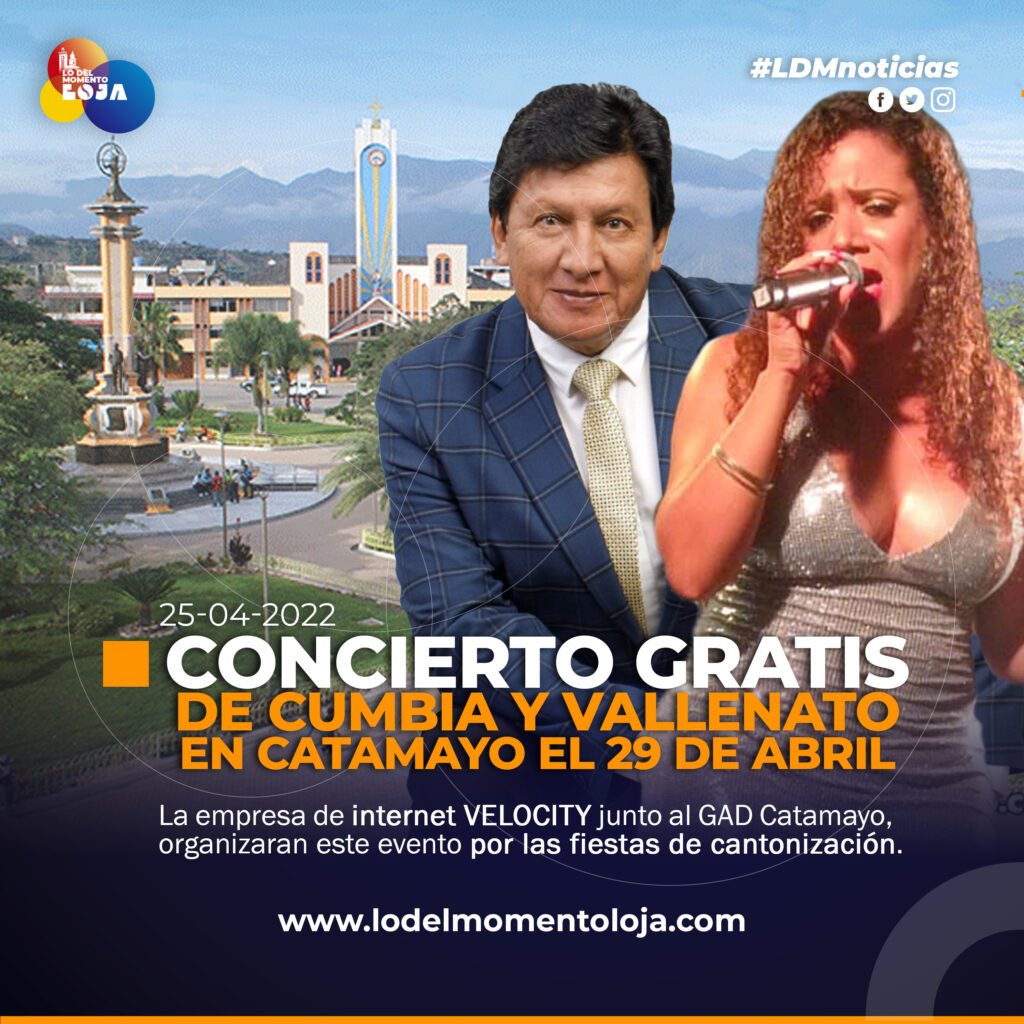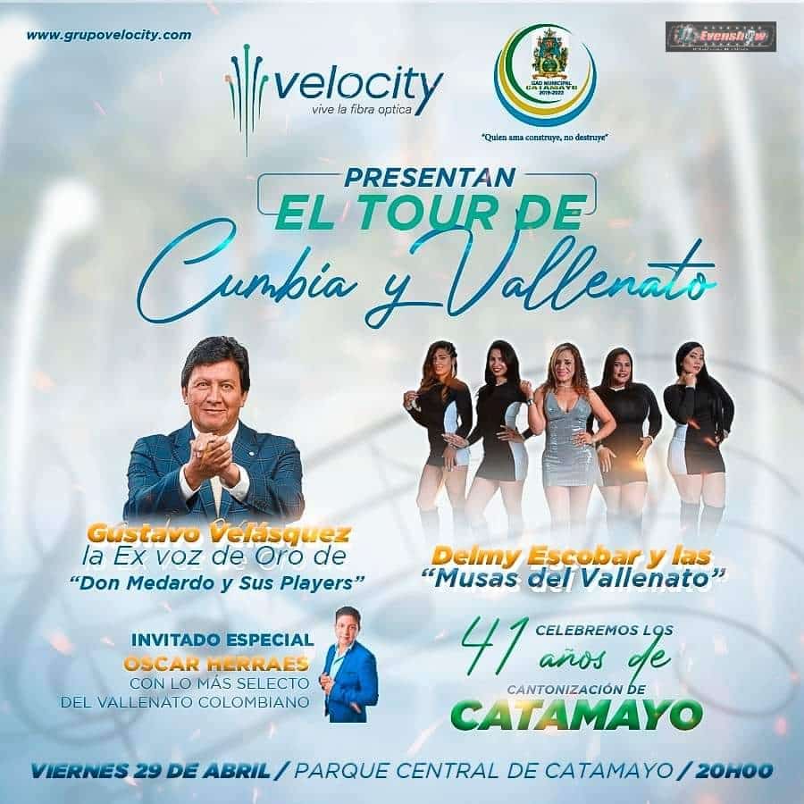 La empresa de internet Velocity y el Municipio formará parte del Tour “Cumbia y Vallenato” para celebrar los 41 años de cantonización de la ciudad de Catamayo, evento que contará con la participación de Gustavo Velázquez, ex voz de oro de “Don Medardo y sus Players” y el grupo ícono de Colombia con Delmy Escobar y las Musas del Vallenato.