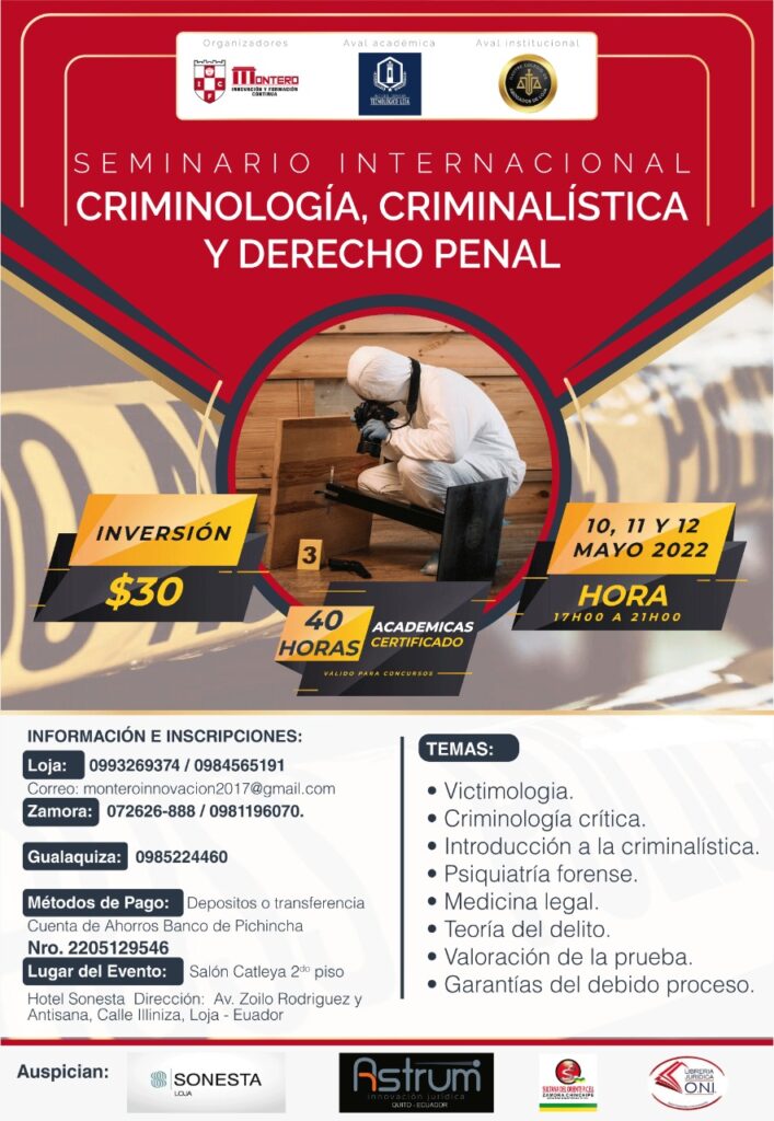 En la ciudad de Loja se realizará el SEMINARIO INTERNACIONAL DE CRIMINOLOGÍA, CRIMINALÍSTICA Y DERECHO PENAL, este evento se dará los días martes 10, miércoles 11 y jueves 12 de mayo del 2022, desde las 17h00 a 21h00 en las instalaciones del Hotel Sonesta y vía virtual para quienes no puedan ir de forma física.