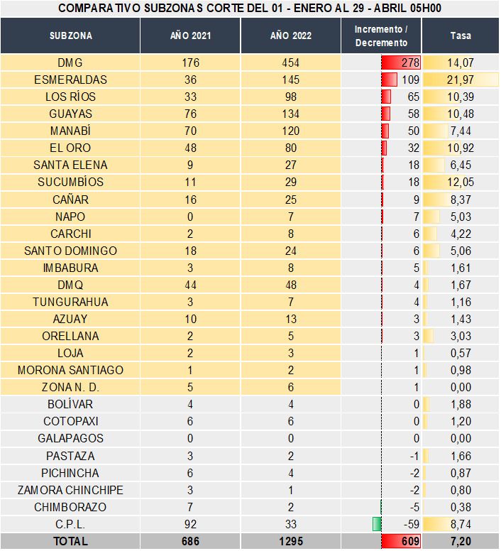 En lo que va del presente año 2022, en el Ecuador, desde el 01 de enero al 26 de abril 2022, se han registrado un total de 1.295 muertes violentas, lo que significaría un aumento de 609 casos en comparación al periodo 2021, es decir, más de doble, este índice es un indicador de violencia e inseguridad.