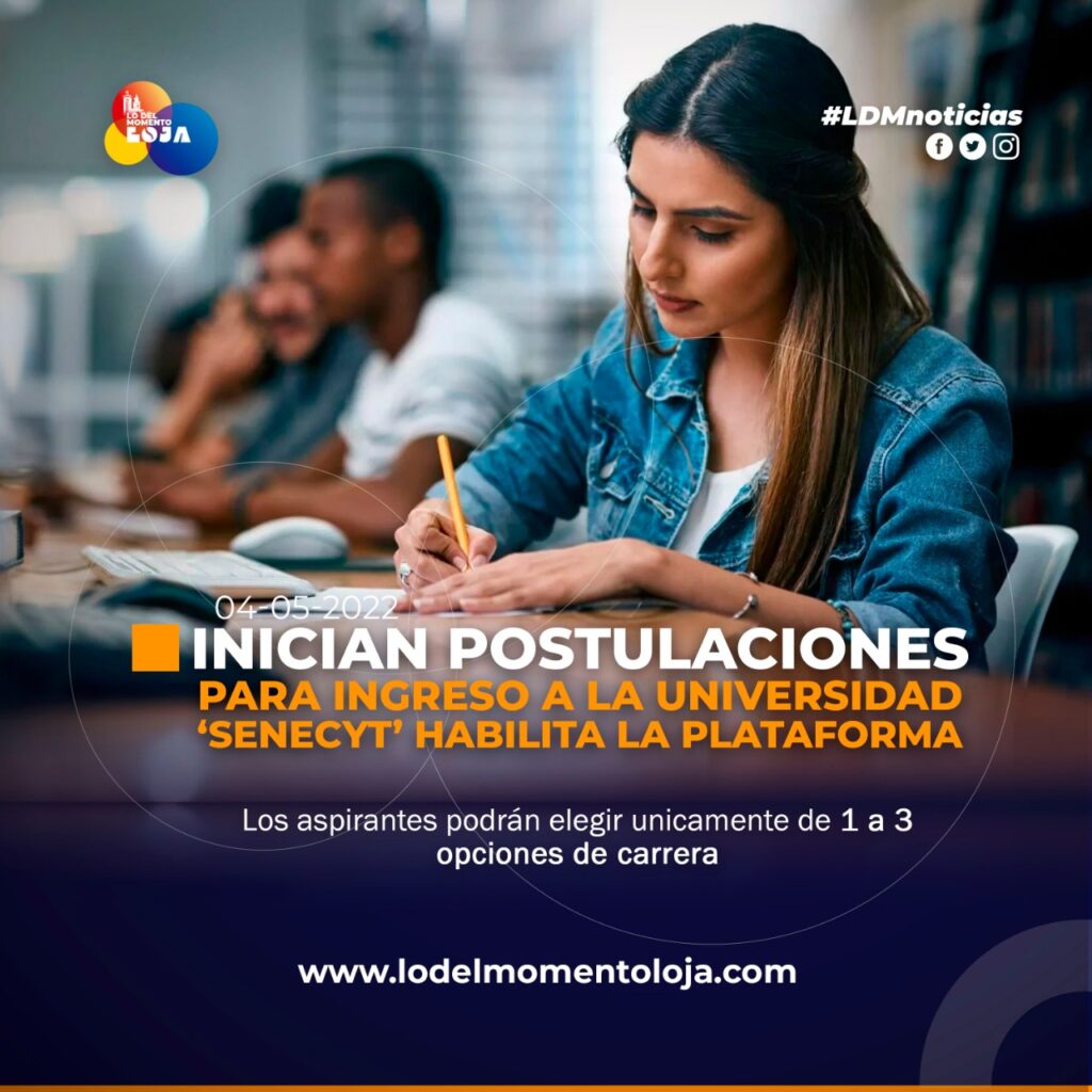 La Secretaría de Educación Superior, Ciencia, Tecnología e Innovación (SENESCYT), informó que a partir del medio día de hoy, hasta el Viernes 06 de Mayo, se habilitará la plataforma para la primera postulación por un cupo para acceder a la educación superior en cualquier universidad del Ecuador.