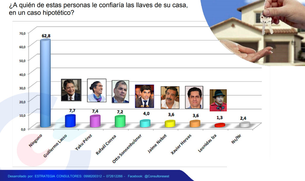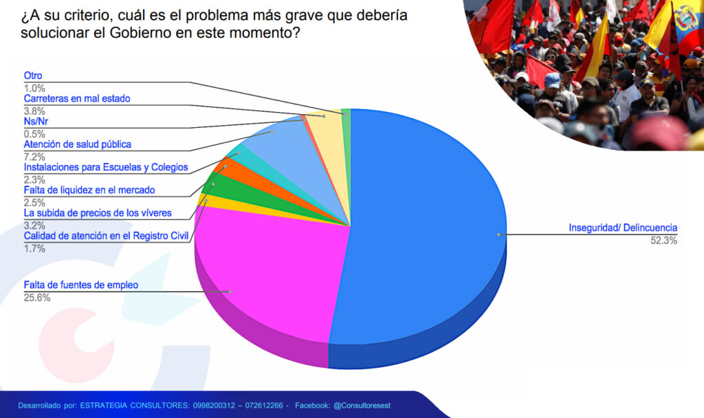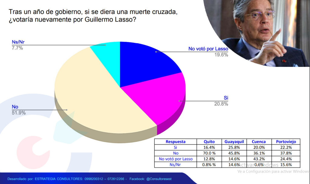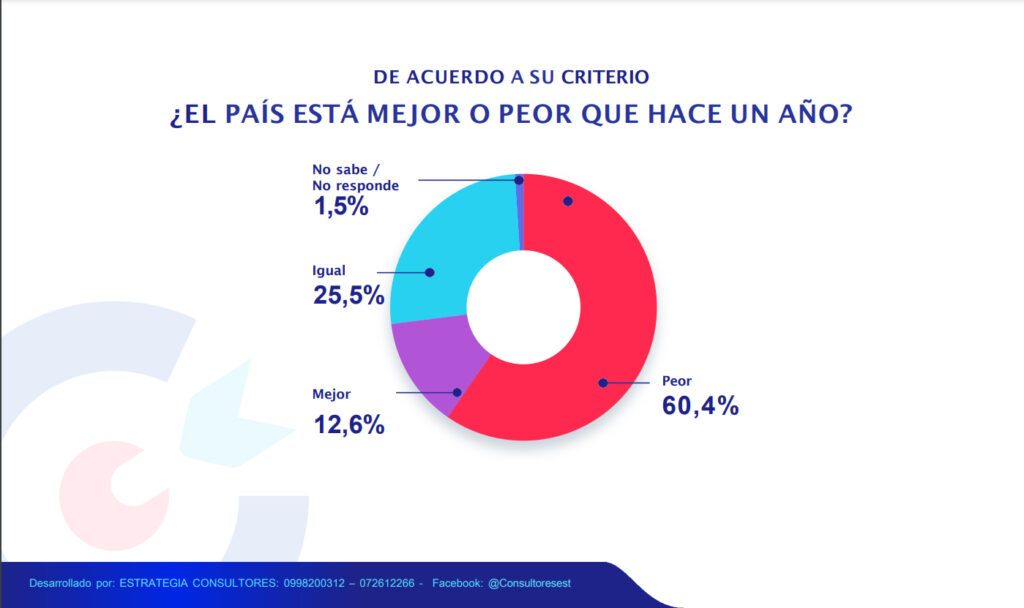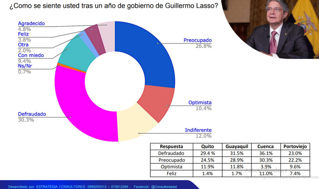 La encuestadora Estrategia Consultores, realizó un sondeo de opinión ciudadano en cuatro de las principales ciudades del Ecuador, como son: Quito, Guayaquil, Cuenca y Portoviejo, de los cuales se evaluó a 1006 casos en el periodo de 15 al 18 de mayo del 2022, dejando un panorama de como ven los ecuatorianos a un año del Gobierno del encuentro del presidente Guillermo Lasso.