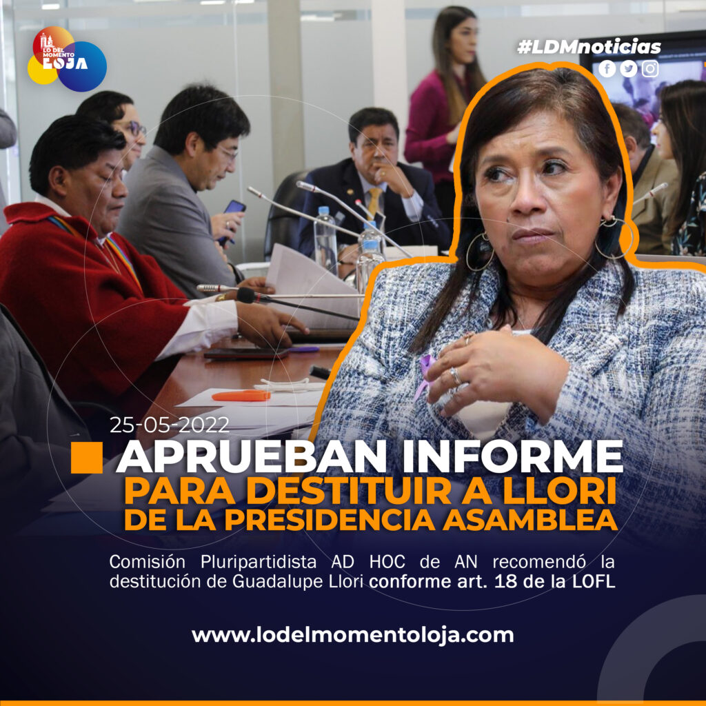 Desde Comisión Pluripartidista Ad Hoc de la Asamblea Nacional, se aprobó de manera unánime el informe que recomienda la destitución de Guadalupe Llori del cargo de Presidenta de la Asamblea Nacional conforme lo estipula el Art. 18 de la Ley Orgánica de la Función Legislativa.