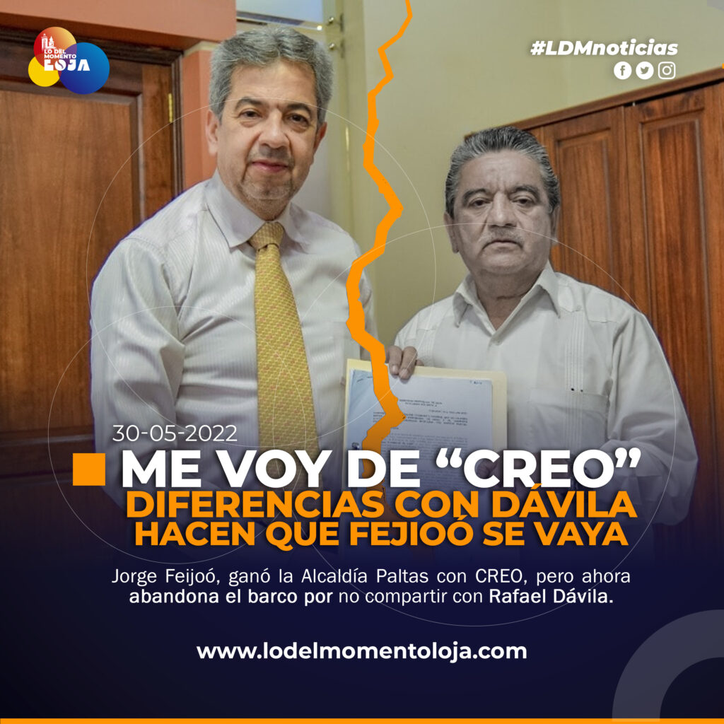 El burgomaestre paltense Jorge Luis Feijoó, anunció su salida del partido político CREO lista 21 y añadió que se encuentra definiendo situaciones de orden y carácter político para formar parte de un nuevo movimiento.