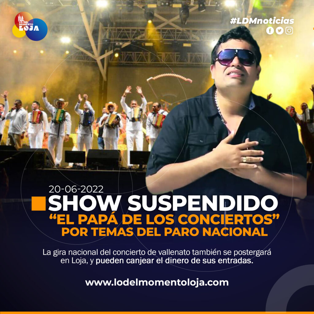 #Loja | “El papá de los conciertos” como se denominada la gira del conciertos de vallenato en Ecuador, se suspenderá en las diferentes provincias donde se anunciaba el concierto, como Quito, Ambato, Cuenca; esto por temas relacionados al Paro Nacional y el decreto de estado de excepción en provincias -Imbabura/Pichincha y Cotopaxi- ubicadas en la región centro y norte del país donde se han producido protestas en contra del mandato del presidente Guillermo Lasso.