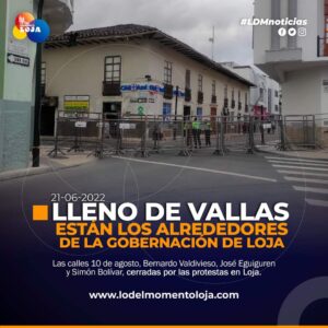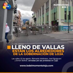 A razón de las movilizaciones del pueblo Saraguro a la ciudad en relación al Paro Nacional Ecuador 2022, autoridades del ejecutivo han llenado de vallas alrededor de la Gobernación de Loja, acto que inhabilita el tránsito en las 4 principales calles, como: 10 de agosto, Bernardo Valdivieso, José Eguiguren y Simón Bolívar.