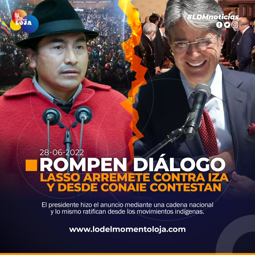 El primer mandatario ecuatoriano, Guillermo Lasso, mediante un mensaje en cadena nacional, anunció que se ha roto el diálogo con Leonidas Iza, presidente de la Confederación de Nacionalidades Indígenas (CONAIE), esto en el marco de lo sucedido en Saquisili, donde se produjo un enfrentamiento entre comuneros y Fuerzas Militares, del que se produjo varios heridos y un muerto, añadiendo que van a defender la democracia y no permitirán que se destruya la institucionalidad del Ecuador. “Ustedes merecen más que un oportunista como líder, que los ha engañado a ustedes y a todo un país” refriéndose a la cabeza de la CONAIE.