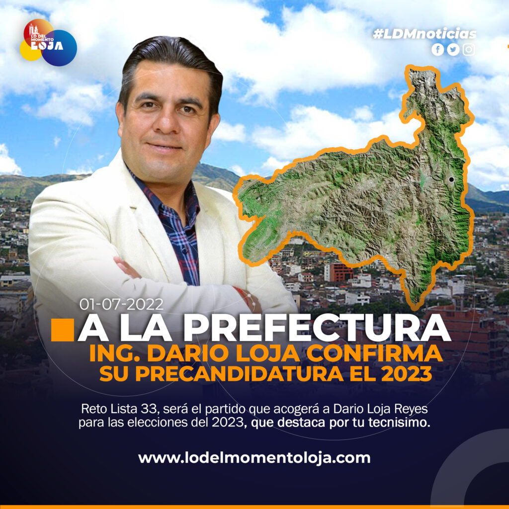 Darío Loja Reyes, actual concejal de Loja, ha confirmado su participación como precandidato a la Prefectura de Loja en las elecciones del 2023, esto bajo el auspicio del movimiento político RETO Lista 33, movimiento constituido a nivel nacional que aspira con Loja llegar a la institución que esta bajo la tutela de Rafael Dávila del movimiento CREO.