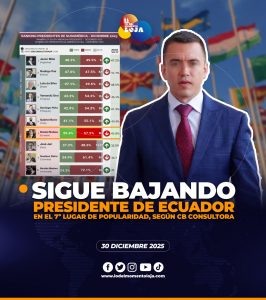 ECUADOR INICIO LOJA Presidente de Ecuador en el 7º lugar de popularidad según Consultora de Opinión Pública. admin 2025 0 😱📊📉¡Así termina el año! La nueva medición internacional de popularidad presidencial en Sudamérica, elaborada por la firma CB Consultora Opinión... Leer más